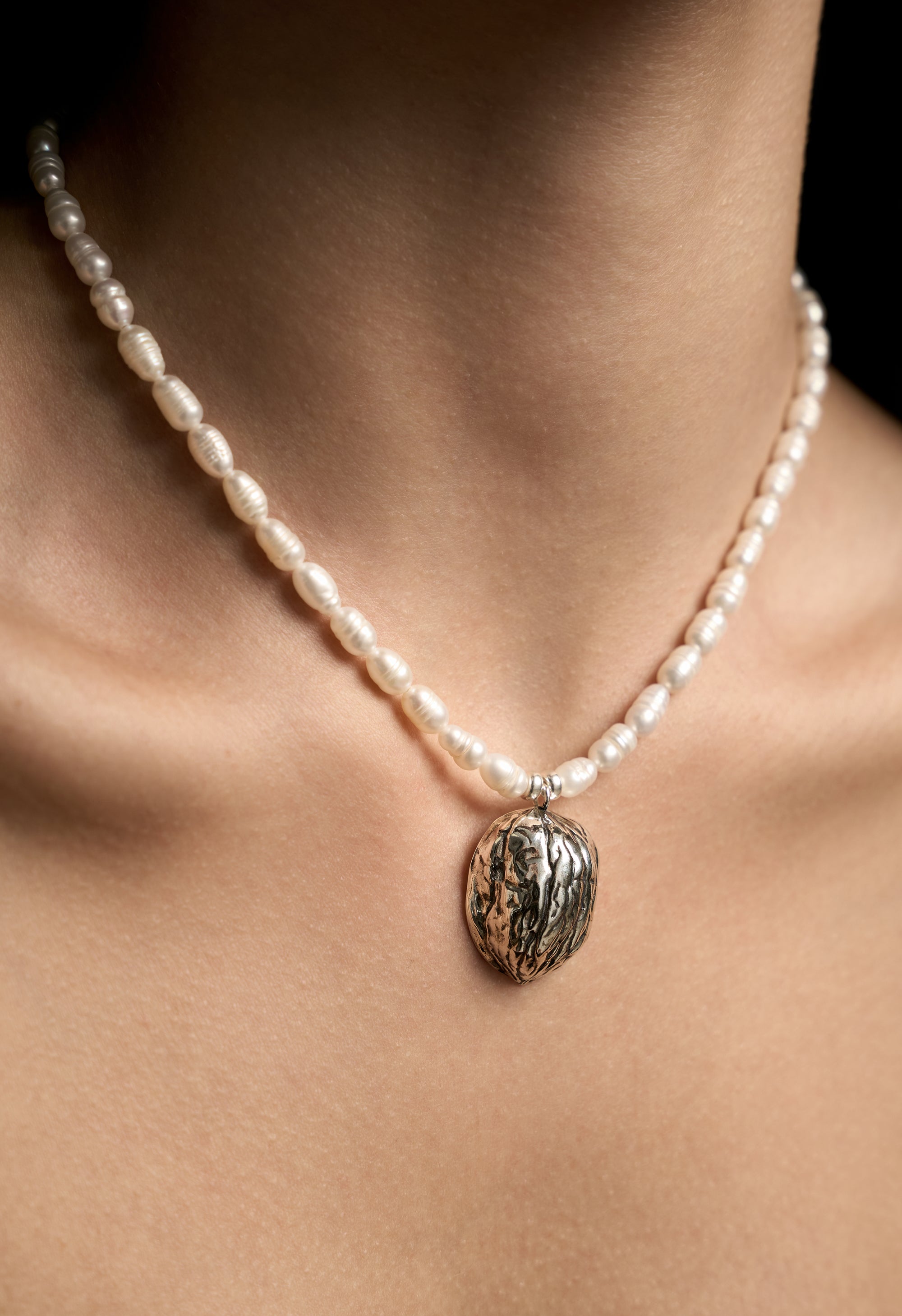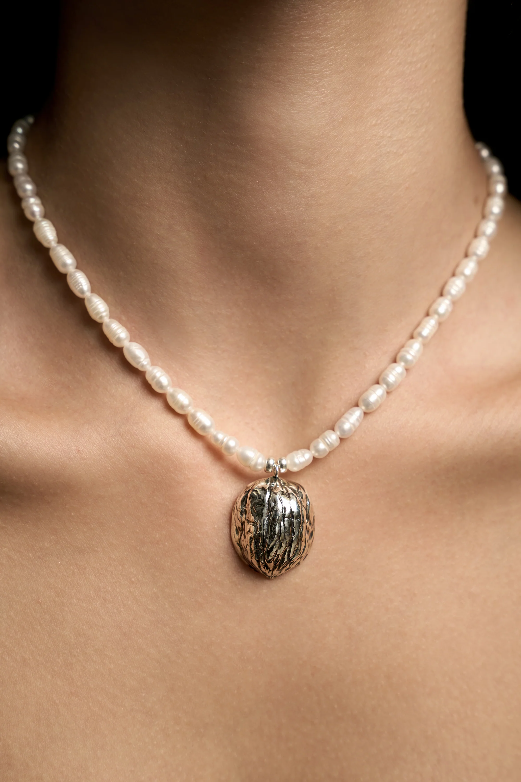 Náhrdelník doplněný pravými říčními perlami a stříbrným přívěskem Krakatuk