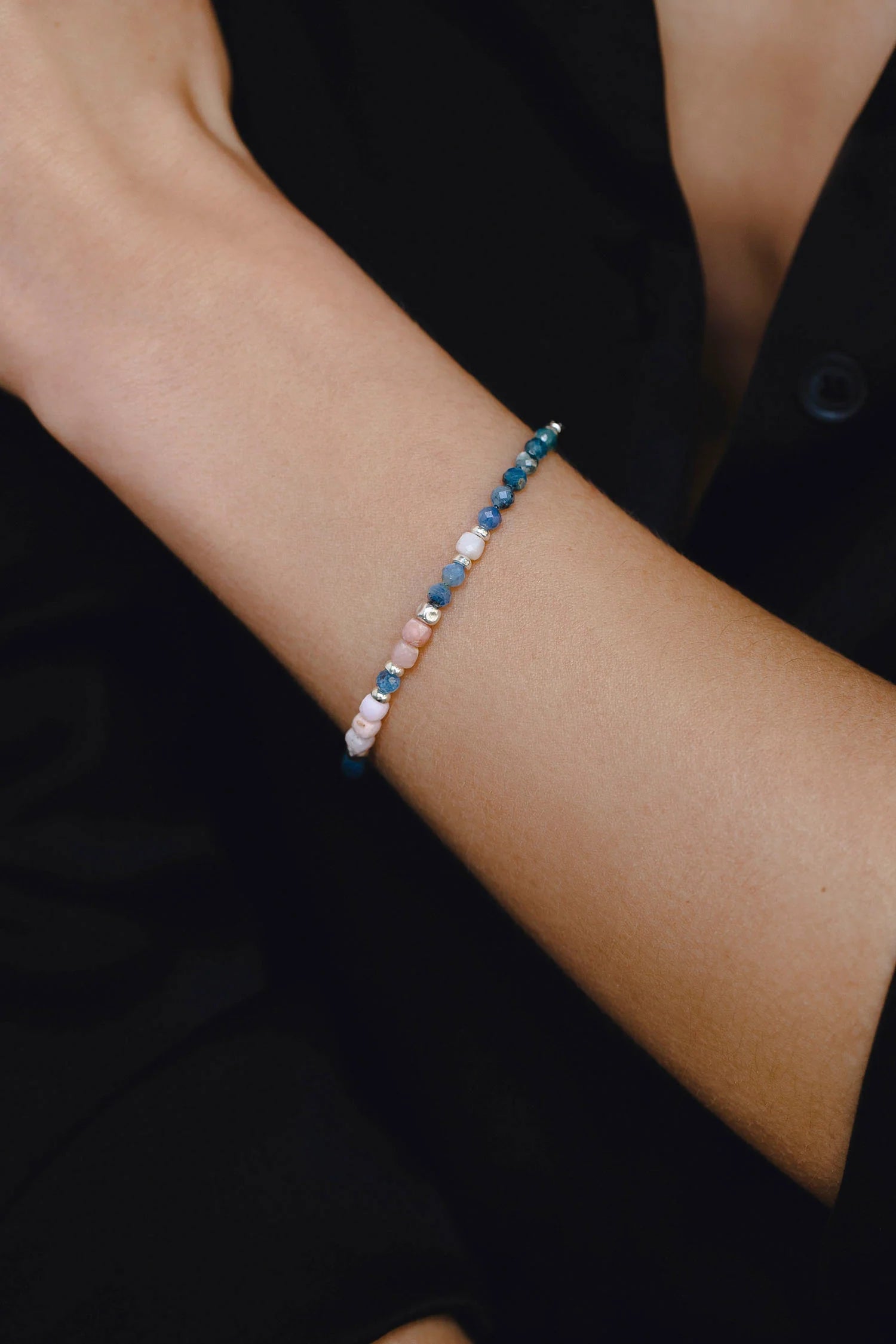 Náramek s přírodními kameny: kyanit a opál. Ideální pro kombinaci s dalšími náramky.